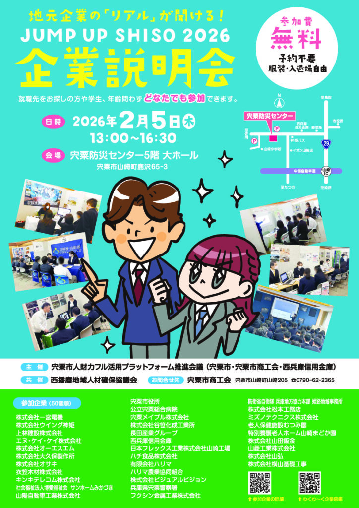 JUMP UP SHISO 2026 2025.11.19 お知らせ 開催日時:令和8年2月5日(木)13:00〜16:30会 場:宍粟防災センター 5階 大ホール住 所:〒671-2576 宍粟市山崎町鹿沢65-3 (33社)企業冊子 確定版R71211_compressedダウンロード